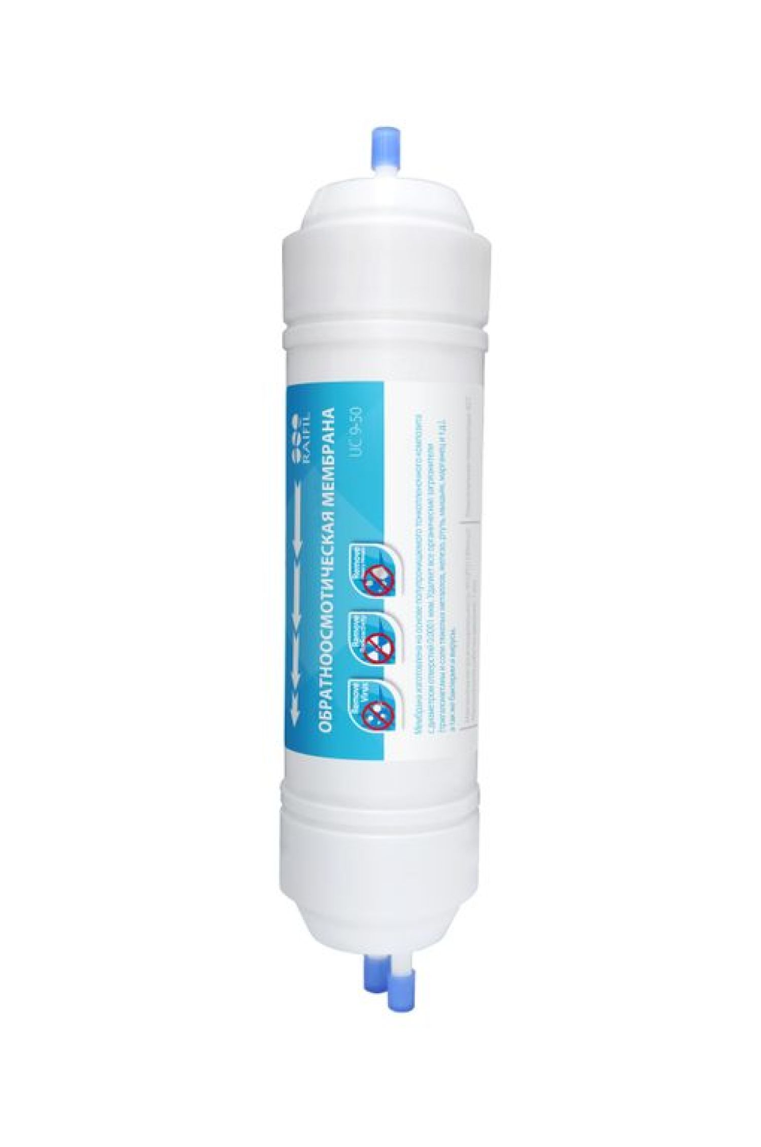 В пластиковый корпус 9" х 2,5" помещена высококачественная обратноосмотичесская мембрана корейского производства с суточной производительностью 50GPD (190 литров в сутки). Главный элемент системы обратного осмоса меняется целиком, что существенно облегчает обслуживание фильтра. Благодаря неразборной конструкции модуля, полностью исключается вероятность протечки уплотнения крышки и фактор старения пластика многоразового корпуса мембранного элемента. Модуль совместим с системами обратного осмоса любых производителей и устанавливается на стандартные крепежные клипсы 2,5".