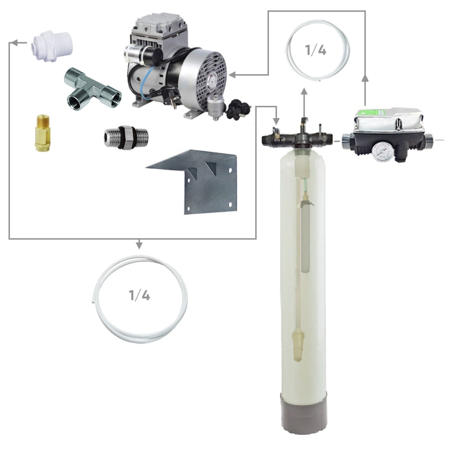 Напорная аэрация подразумевает отсутствие потери давления в трубопроводе. При напорной аэрации воды воздух при помощи компрессора или эжектора подается в трубопровод. Далее водо-воздушная смесь подается в контактную камеру: напорный корпус или на статический миксер, обеспечивающий необходимое время контакта. Из контактной камеры вода поступает на систему фильтрации практически без потери исходного давления. При использовании напорной аэрации воды в верхней части контактной камеры устанавливают воздухосбросный клапан для удаления лишнего воздуха и удаленных из воды газов. Контактная камера, распределительный оголовок с трубками и восдухосбросный клапан в сборе называются аэрационной колонной.