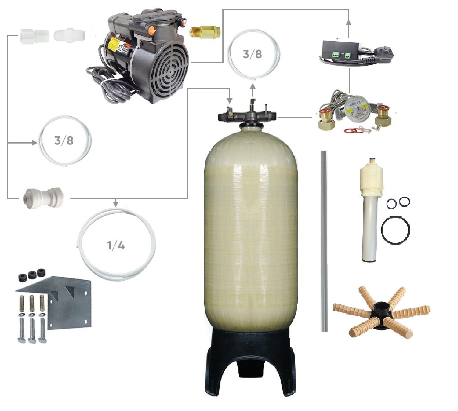 Напорная аэрация подразумевает отсутствие потери давления в трубопроводе. При напорной аэрации воды воздух при помощи компрессора или эжектора подается в трубопровод. Далее водо-воздушная смесь подается в контактную камеру: напорный корпус или на статический миксер, обеспечивающий необходимое время контакта. Из контактной камеры вода поступает на систему фильтрации практически без потери исходного давления. При использовании напорной аэрации воды в верхней части контактной камеры устанавливают воздухосбросный клапан для удаления лишнего воздуха и удаленных из воды газов. Контактная камера, распределительный оголовок с трубками и восдухосбросный клапан в сборе называются аэрационной колонной. Brio 2000 – аппаратура, позволяющая автоматизировать пуск и останов электронасоса в зависимости от понижения давления (открытие кранов) и от остановки потока в системе (закрытие кранов), на которой она установлена. Brio 2000 M выполняет важную функцию останова насоса при отсутствии воды, защищая его от вредной работ