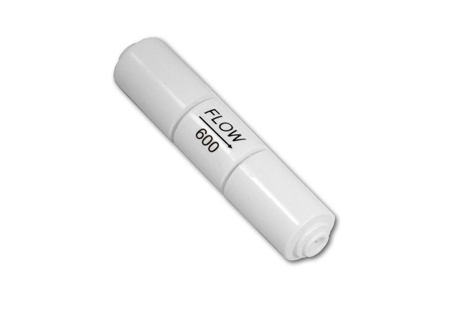 Регулятор дренажа FR-600P-EZ представляет собой цилиндрический корпус с уменьшенным сечением, за счет которого происходит ограничение скорости потока дренажной линии до 600 мл/мин. Подключение к системе обратного осмоса и дренажному сливу осуществляется при помощи двух быстросъемных коннекторов.