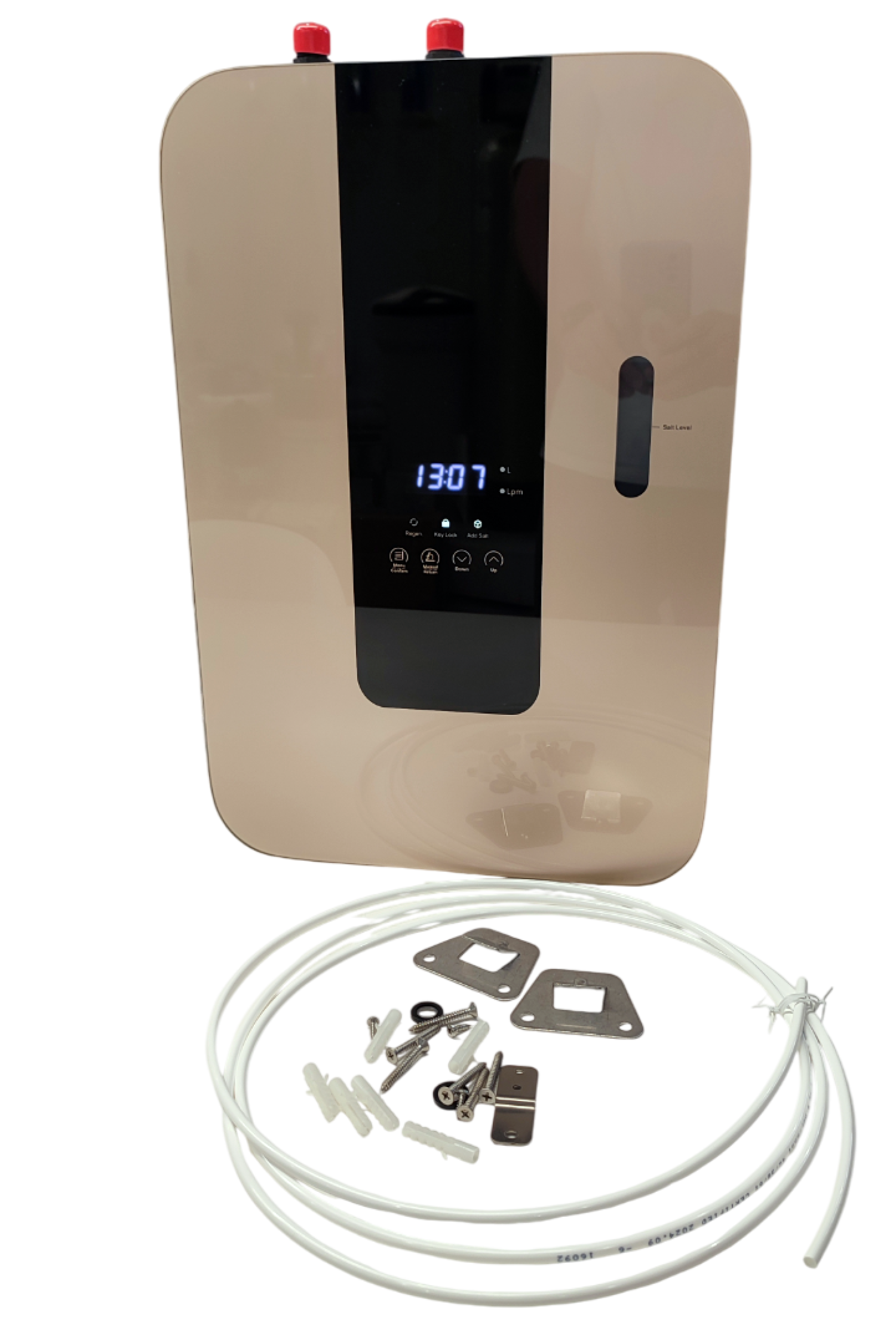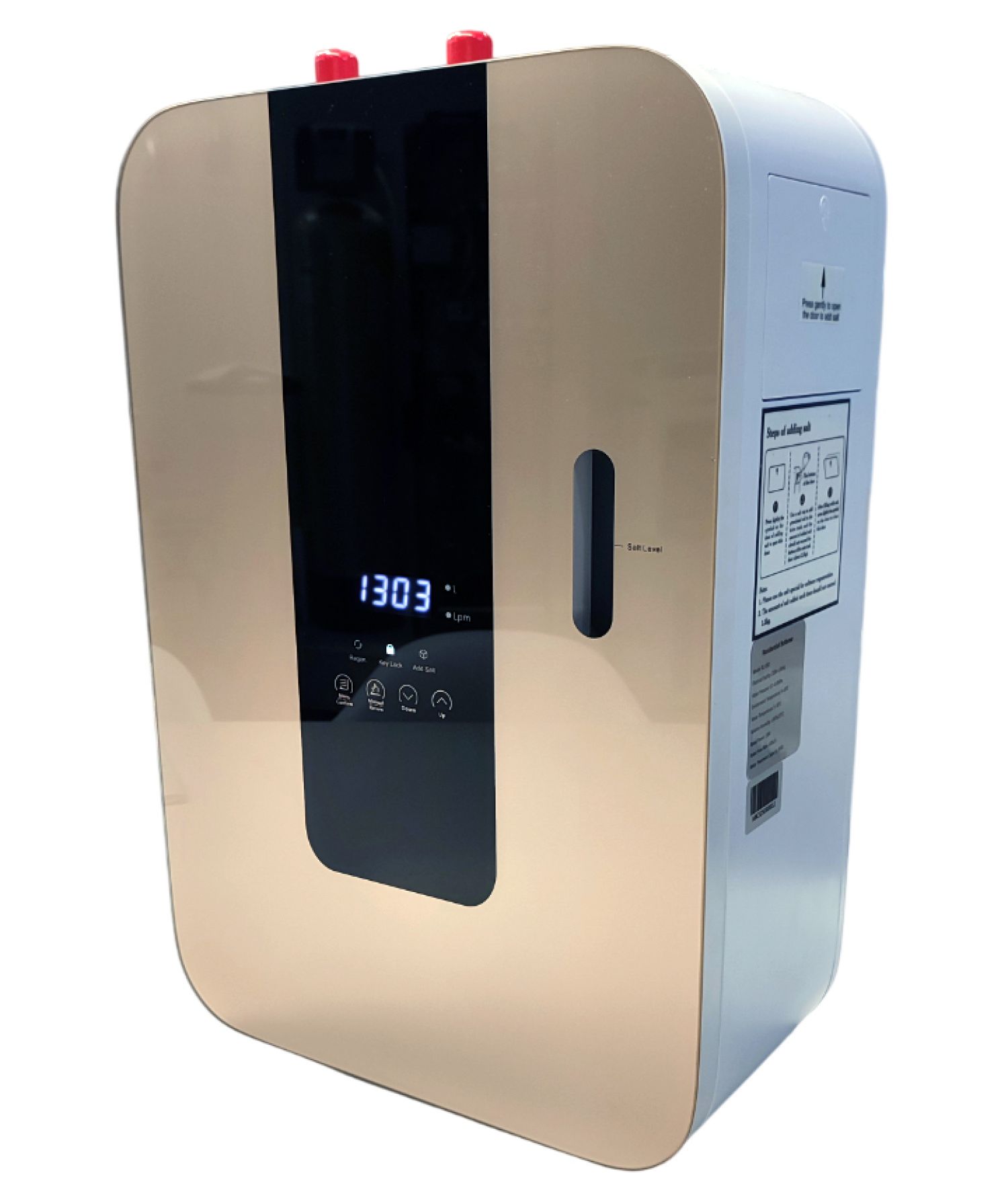 Настенный бытовой умягчитель воды серии M8. Принцип действия — ионный обмен для снижения жёсткости, основная цель — защита водонагревателя и сантехники от накипи. Комплектуется баком для смолы (4.8 л) и съёмным контейнером для таблетированной соли. Оснащён электронным управлением с индикацией и функцией автоматической регенерации по таймеру.