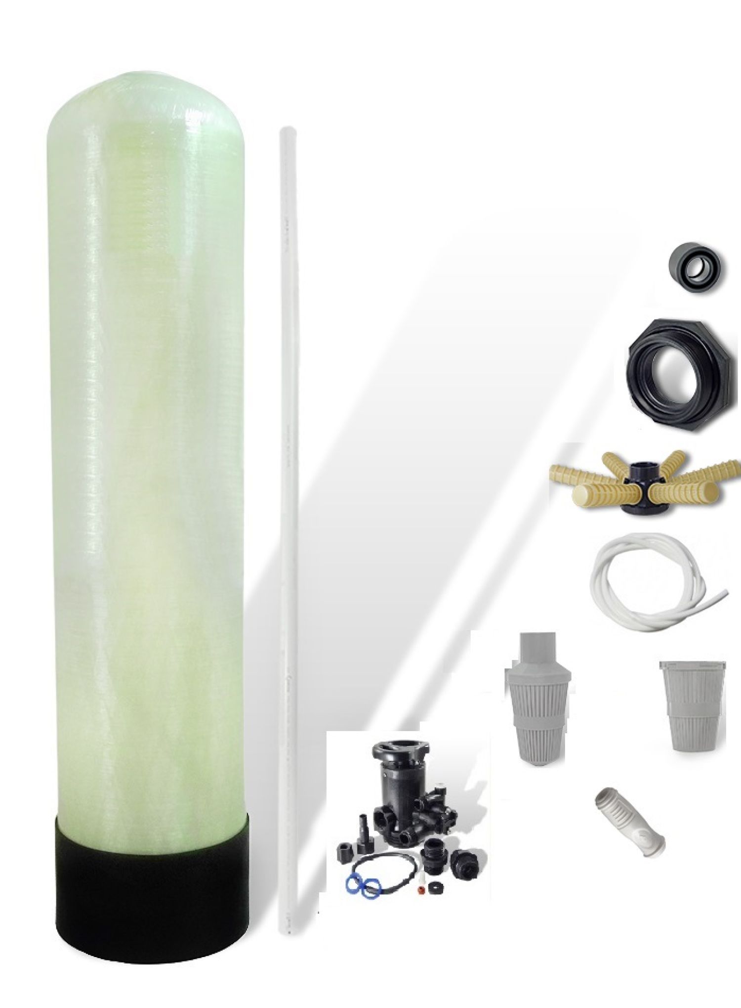 Установки для очистки воды Предназначены для удаления из воды до санитарных норм: - железа общего; - марганца; - сероводорода; - мутности, цветности. Описание: установка состоит из корпуса фильтра, выполненного из стеклопластика внутри ламинированного полиэтиленом, ручного клапана управления, фильтрующей среды, поддерживающего слоя гравия, дренажно-распределительной системы, бака для приготовления регенерационного раствора, воздушного эжектора, предназначенного для подсоса воздуха внутрь корпуса фильтра и реагентной трубки. Принцип действия: Напорные фильтры с зернистой фильтрующей средой, непосредственно окисляющей растворенное железо, марганец и сероводород, которые, проходя сквозь загрузку, переходят в нерастворимую форму и выпадают в осадок. Осадок задерживается в слое фильтрующей загрузки и в дальнейшем вымывается в дренаж при обратной промывке. Через эжектор осуществляется подсос воздуха внутрь корпуса фильтра, в следствие чего формируется воздушный пузырь, ускоряющий процессы окисления железа,