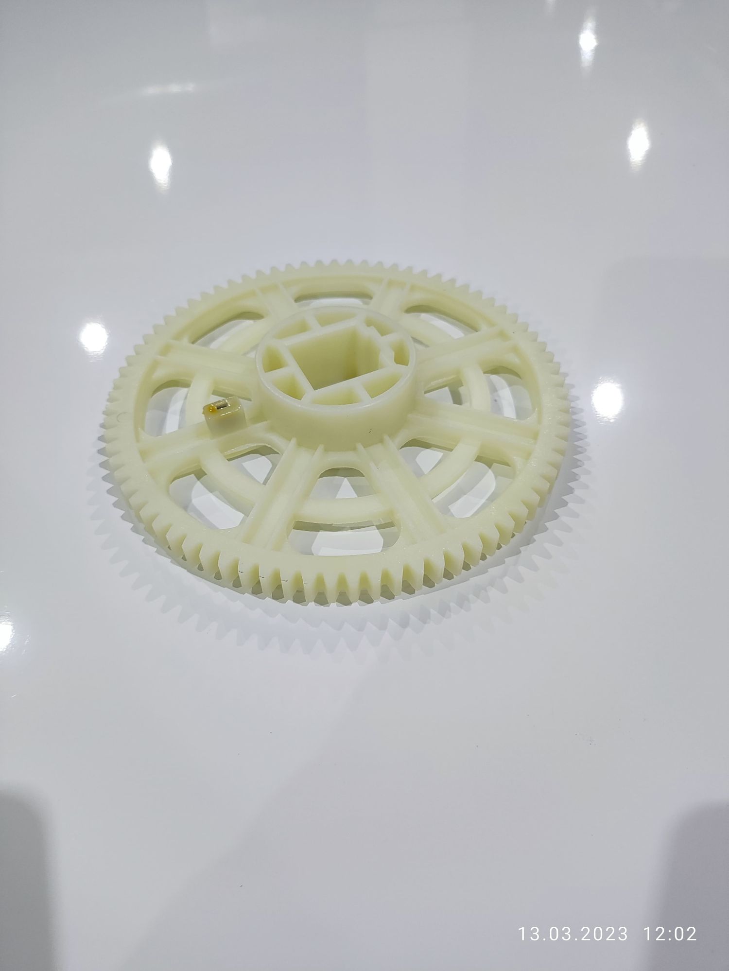 Большая шестерня клапана предназначена для вращения керамического диска распределения потоков воды и определения положения вала привода клапана Runxin. В корпусе шестерни встроен датчик в виде магнита, сигнал от которого передаётся на плату положения вала клапана.